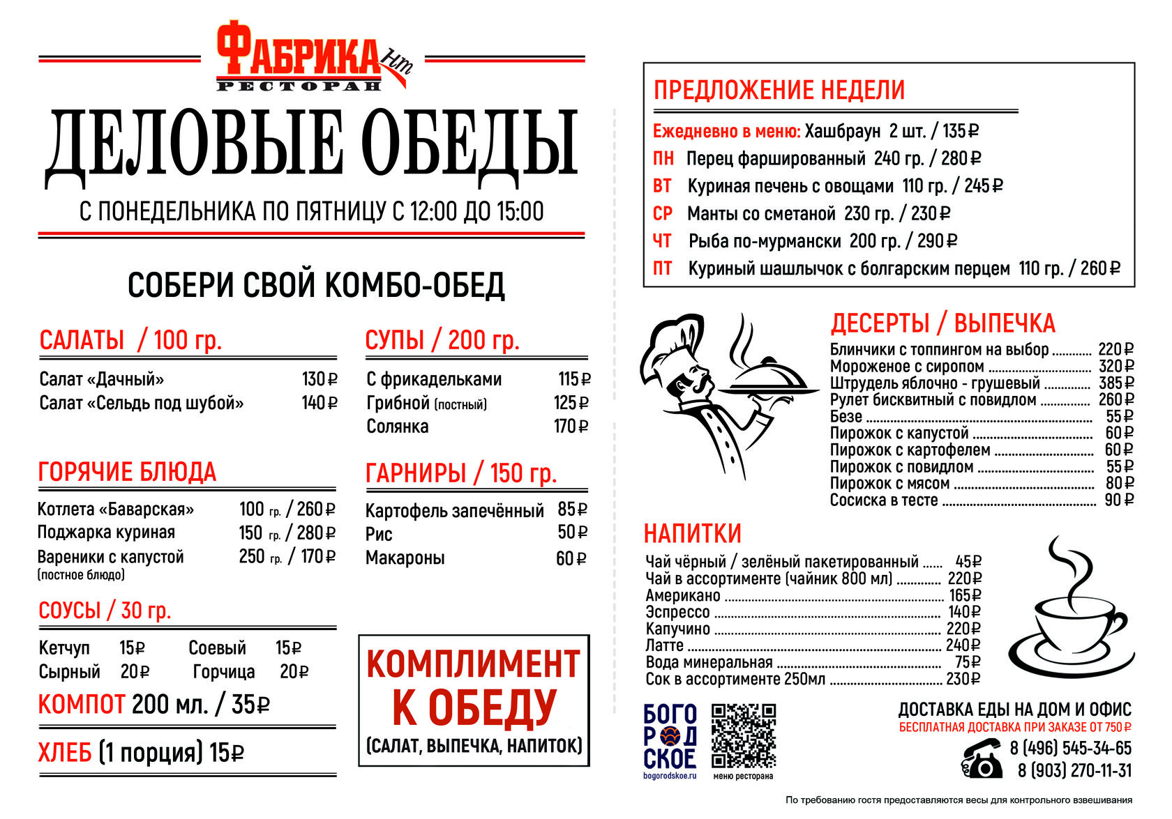 Уважаемые Гости! Приглашаем Вас на деловые обеды в ресторан «ФАБРИКАнт» (гостиница Богородская): с 12:00 до 15:00 - в будние дни. Также Вы можете заказать обеды с доставкой: заказы принимаются с 11:00 до 14:00, доставка осуществляется с 12:00 до 15:00 - будние дни. Бесплатная доставка (по территории рп. Богородское) при заказе от 750 руб., ожидание доставки до 60 минут. (Прилагаем меню на текущую неделю). Комплимент к обеду: салат, выпечка, напиток. Меню, действующее с 06.04. по 10.04.
